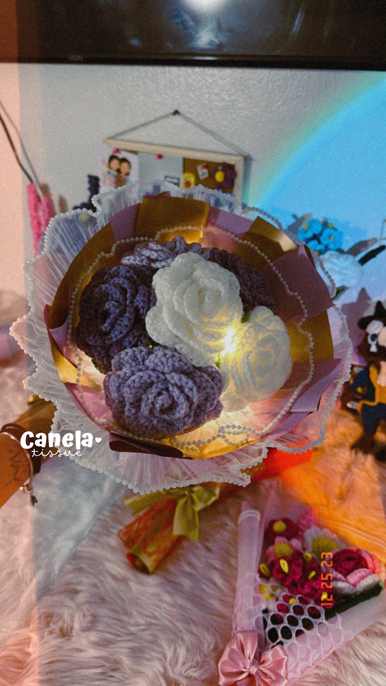 Bouquet of roses in purple and white tones with fairy lights, lined in a thin pearl fabric 💜🦄🪻✨